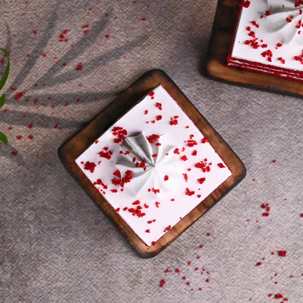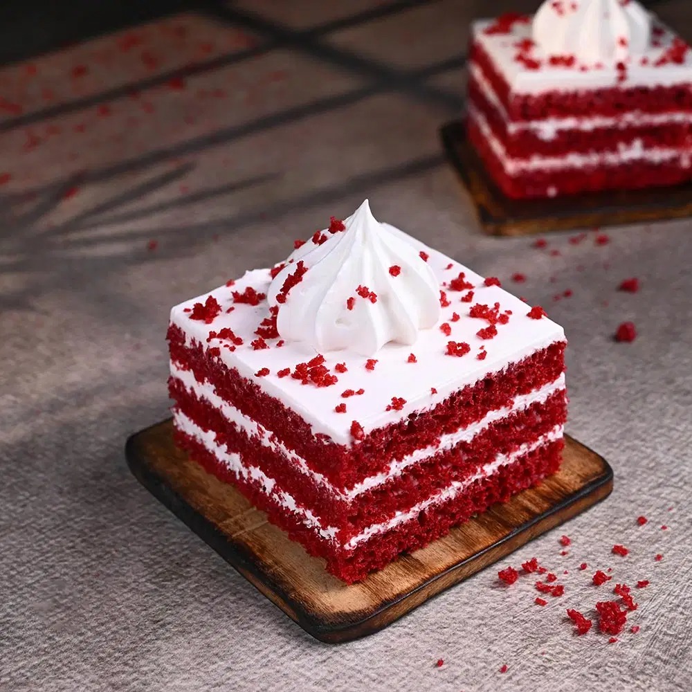 Perfectly square red velvet pastry, layered evenly for flavour you can count on.
