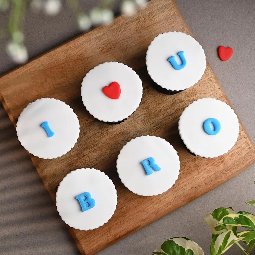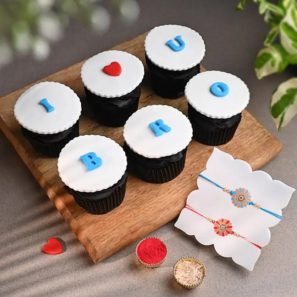 Sweeten your Raksha Bandhan with our delightful set of 6 cupcakes, each lovingly decorated with an “I ❤️ U BRO” message, paired with two designer Rakh...