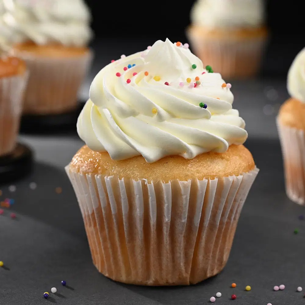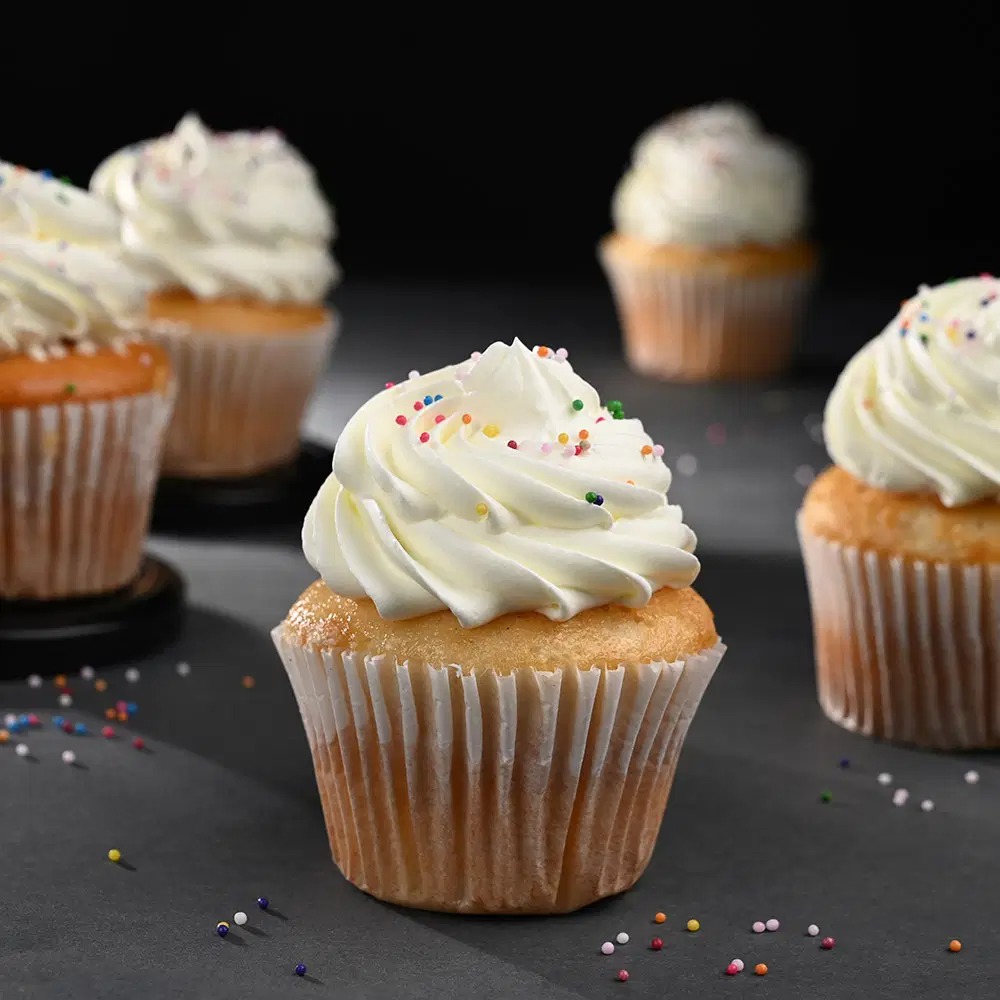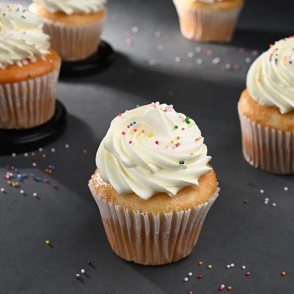 Light, fluffy vanilla base topped with swirls of cream and colorful sprinkles.