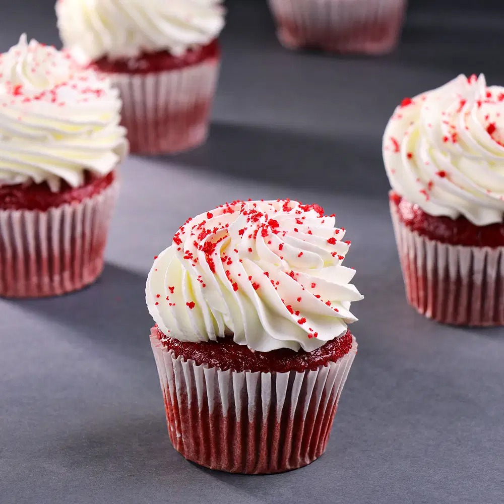 Soft red velvet sponge crowned with smooth cream cheese frosting and ruby crumbs.
