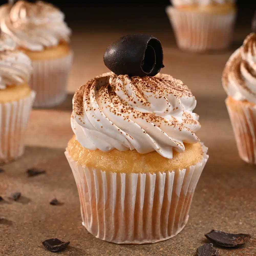 Soft and moist vanilla base, iced with smooth coffee buttercream, garnished with a chocolate curl.