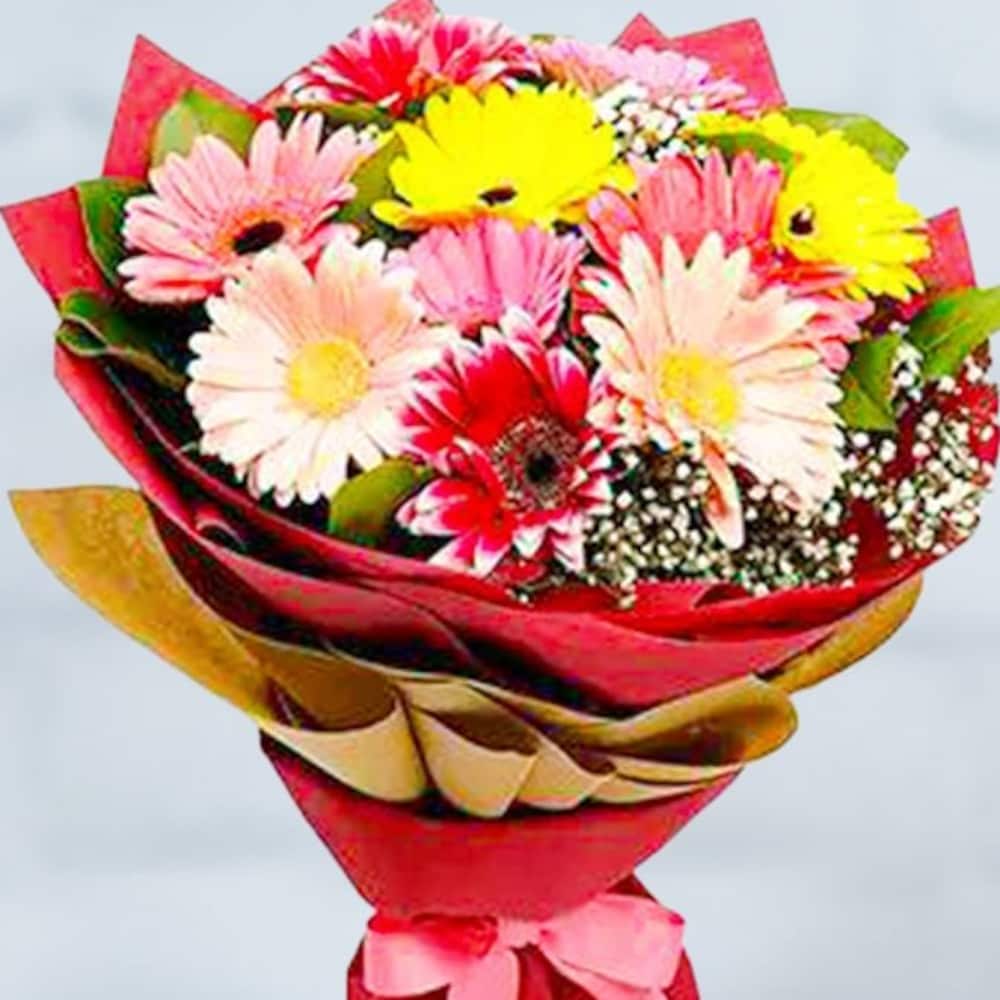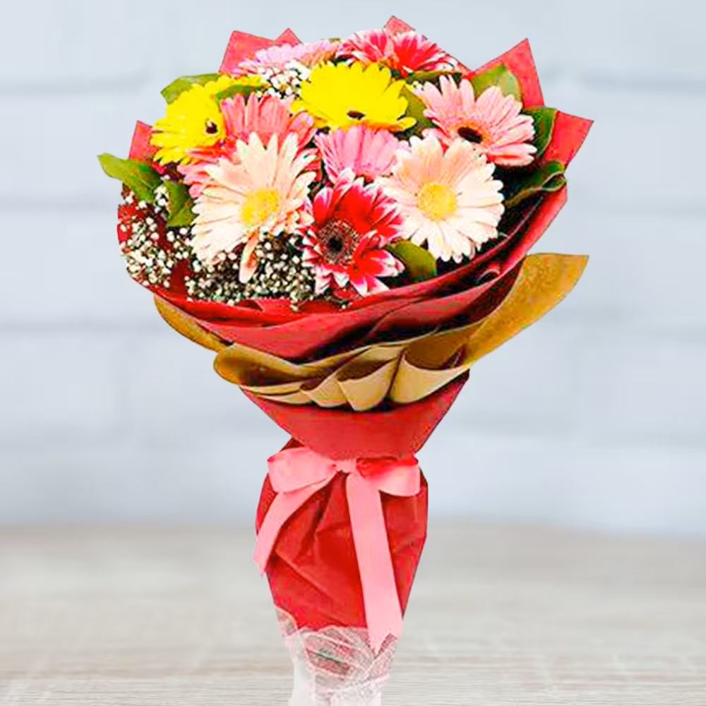 - Flowers Contains: 3 White Gerberas + 3 Pink Gerberas + 2 Yellow Gerberas + 2 Red Gerberas