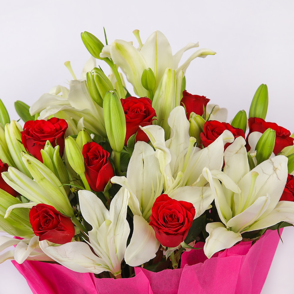 - Flowers Contains: 10 Red Roses , 10 White Lilies