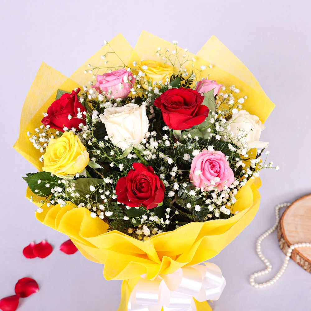 - Flowers Contains: 3 Red Roses , 3 Pink Roses , 2 White Roses , 2 Yellow Roses