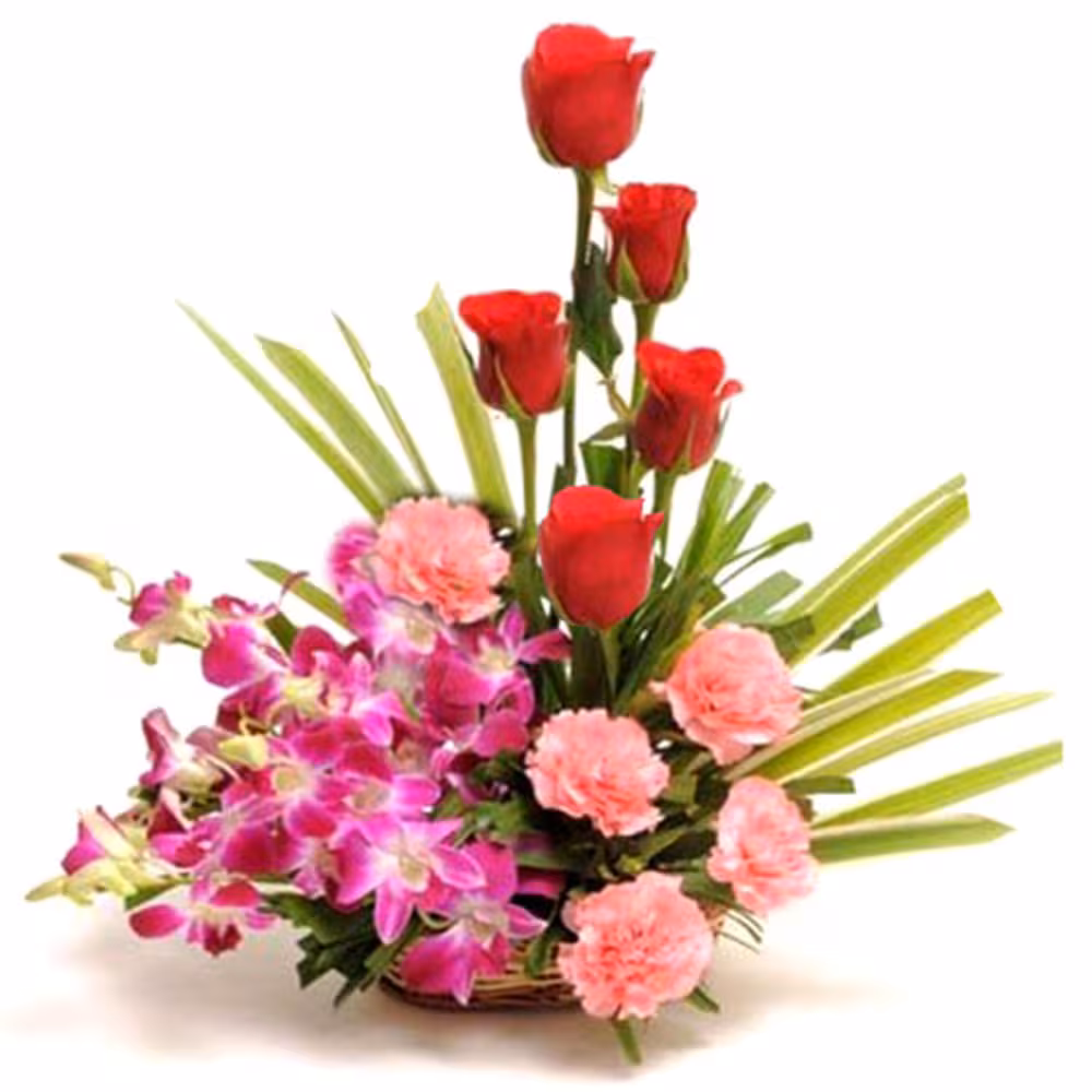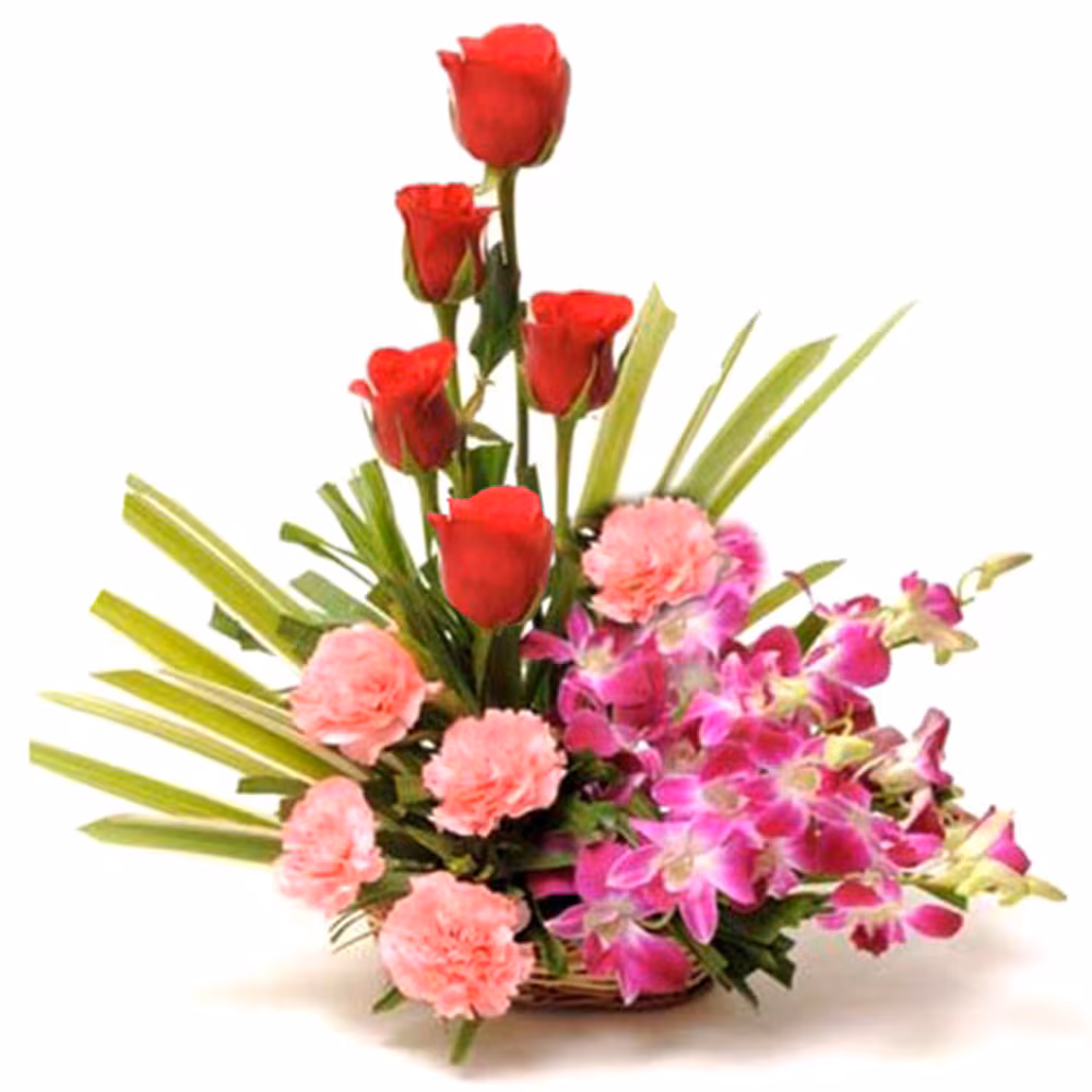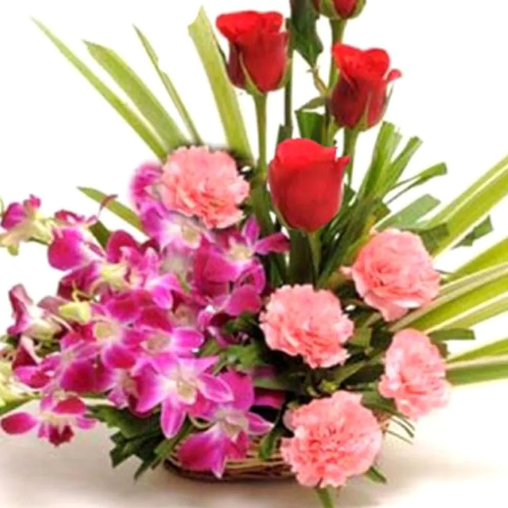 - Flowers Contains: 3 Purple Orchids , 5 Pink Carnations , 5 Red Roses