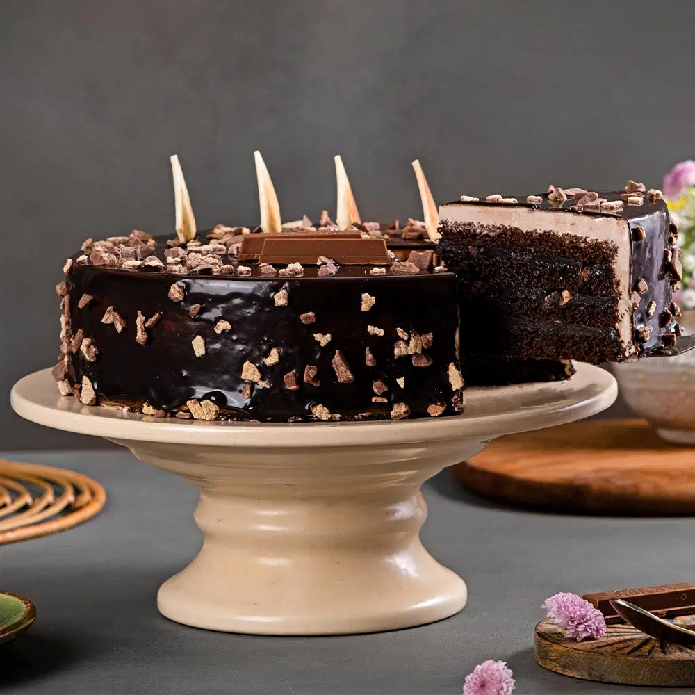 A chocolate truffle cake base with whipped cream frosting, chocolate ganache coating, chopped Kitkat chunks & white chocolate shards.