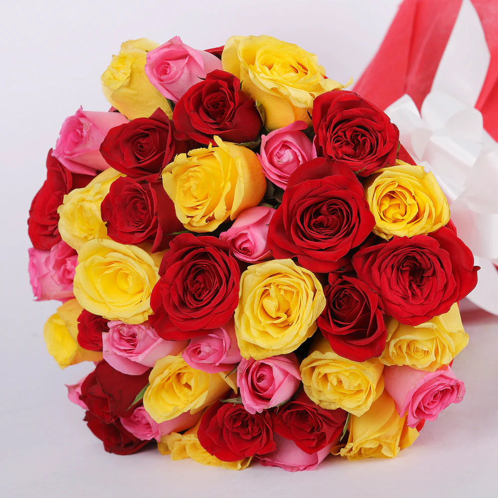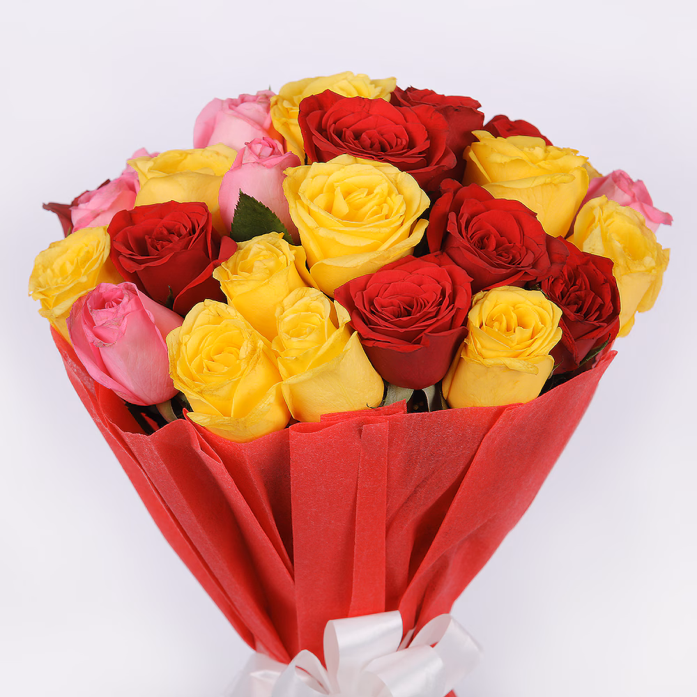 - Flowers Contains: 13 Red Roses + 11 Yellow Roses + 11 Pink Roses