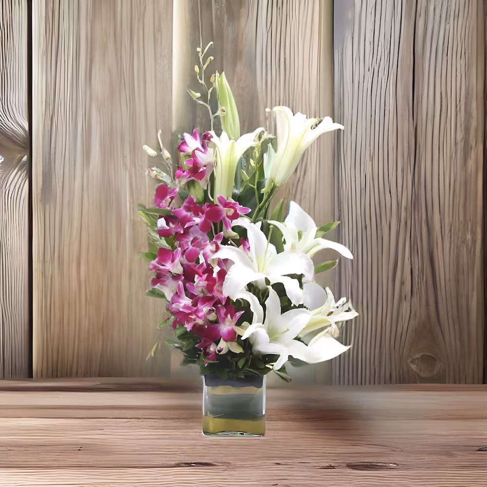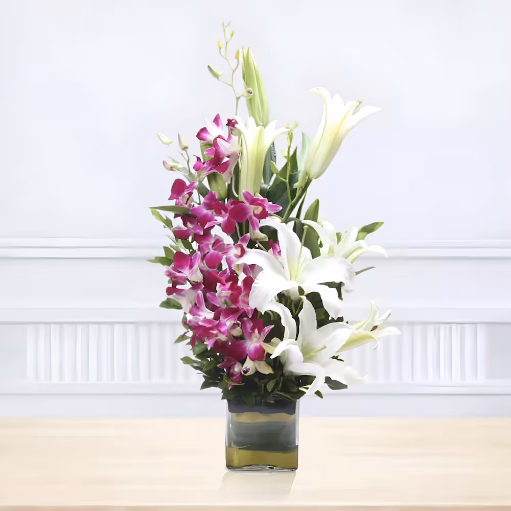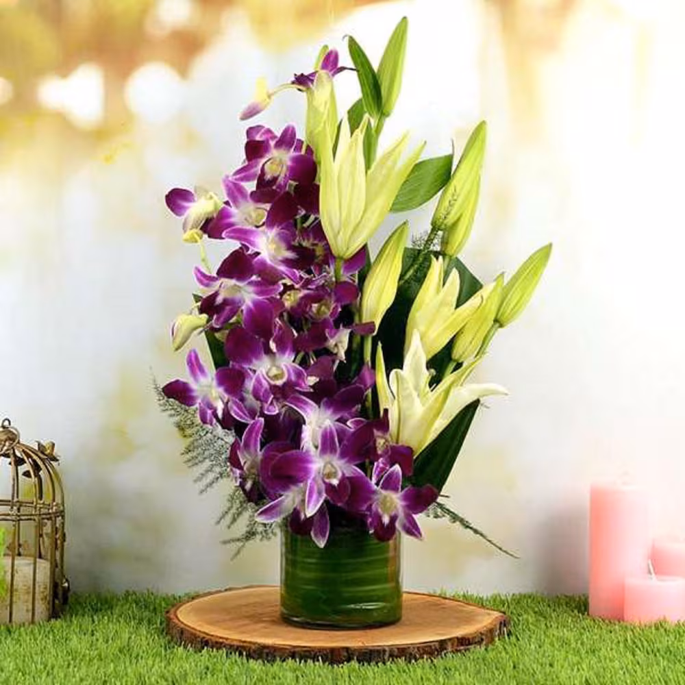 - Flowers Contains: 2 White Lilies , 3 Purple Orchids