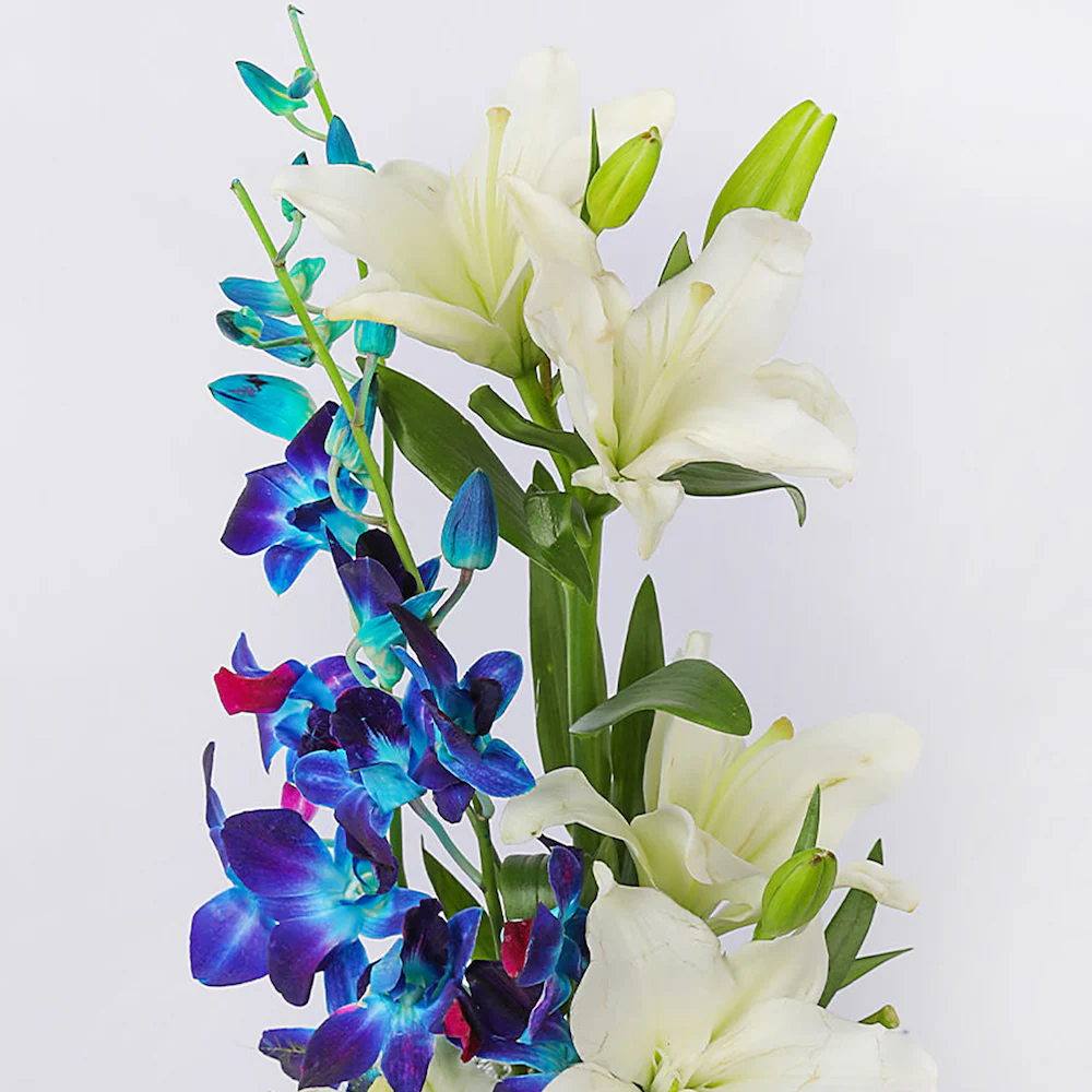 - Flowers Contains: 3 Blue Orchids , 5 White Lilies