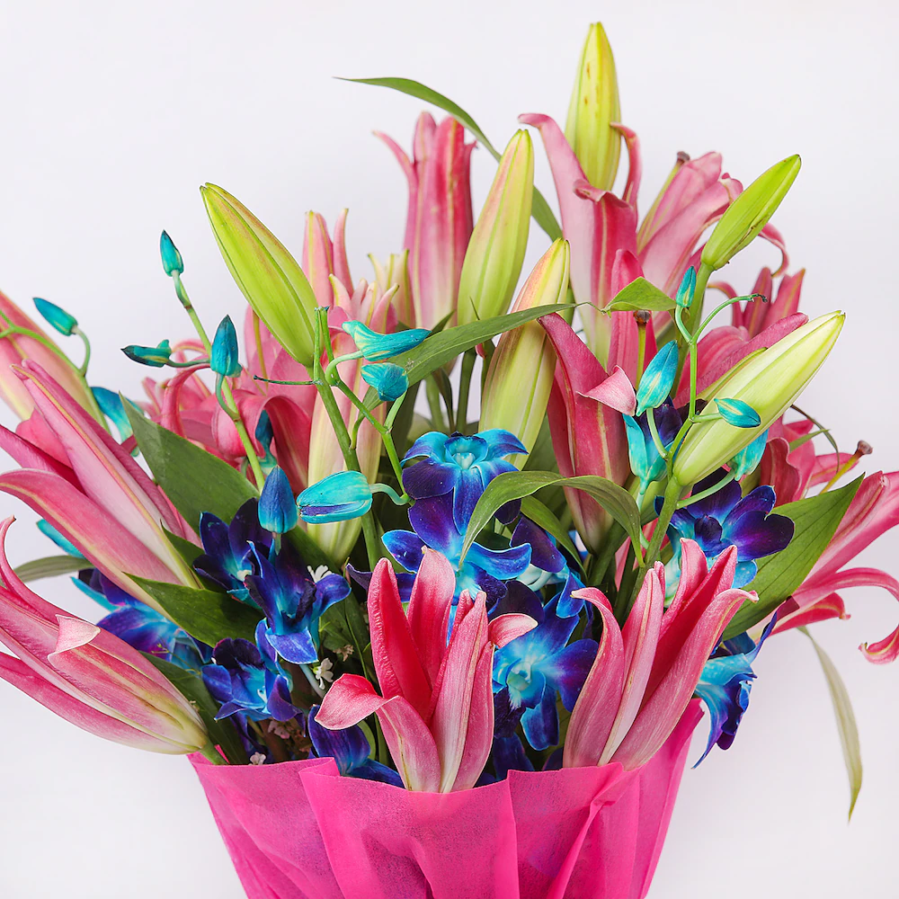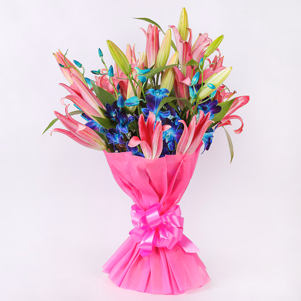 - Flowers Contains: 6 Blue Orchids , 12 Pink Lilies