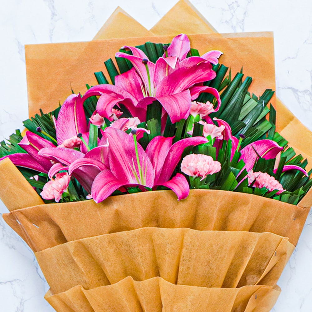 - Flowers Contains: 6 Pink Lilies , 10 Pink Carnations