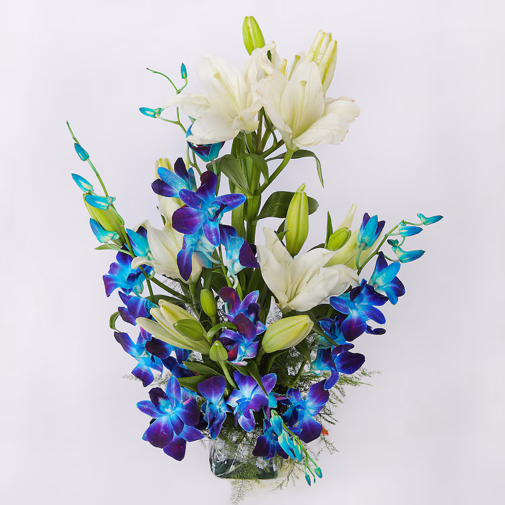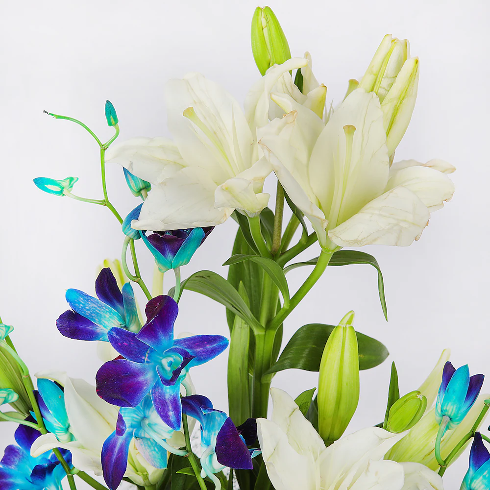 - Flowers Contains: 3 Blue Orchids , 5 White Lilies