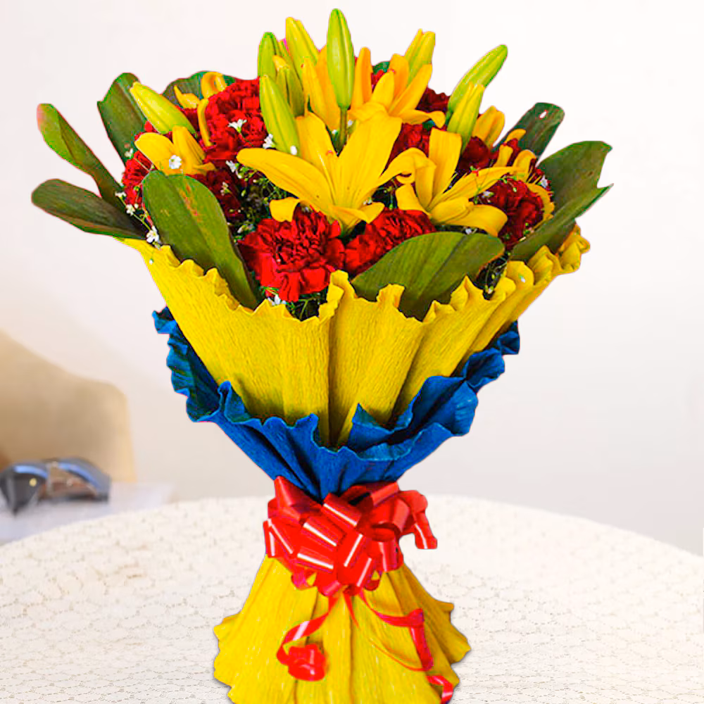 - Flowers Contains: 10 Red Carnations + 5 Yellow Lilies