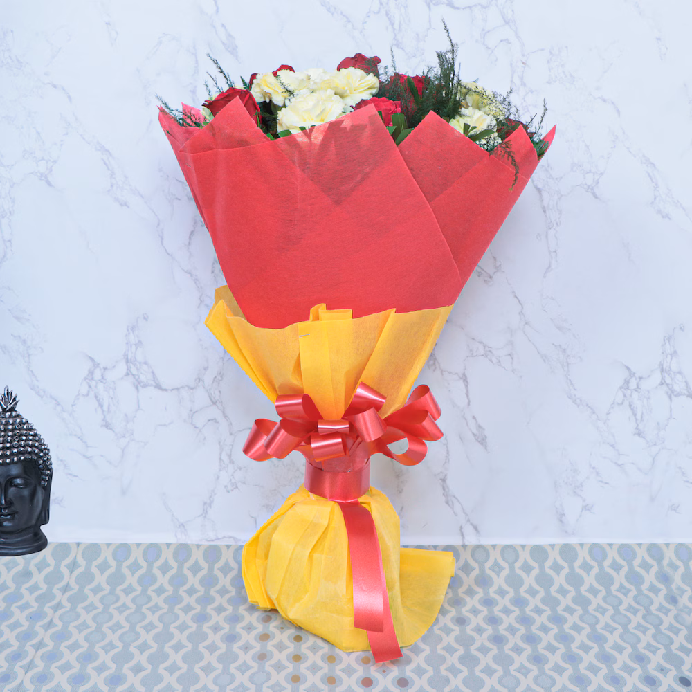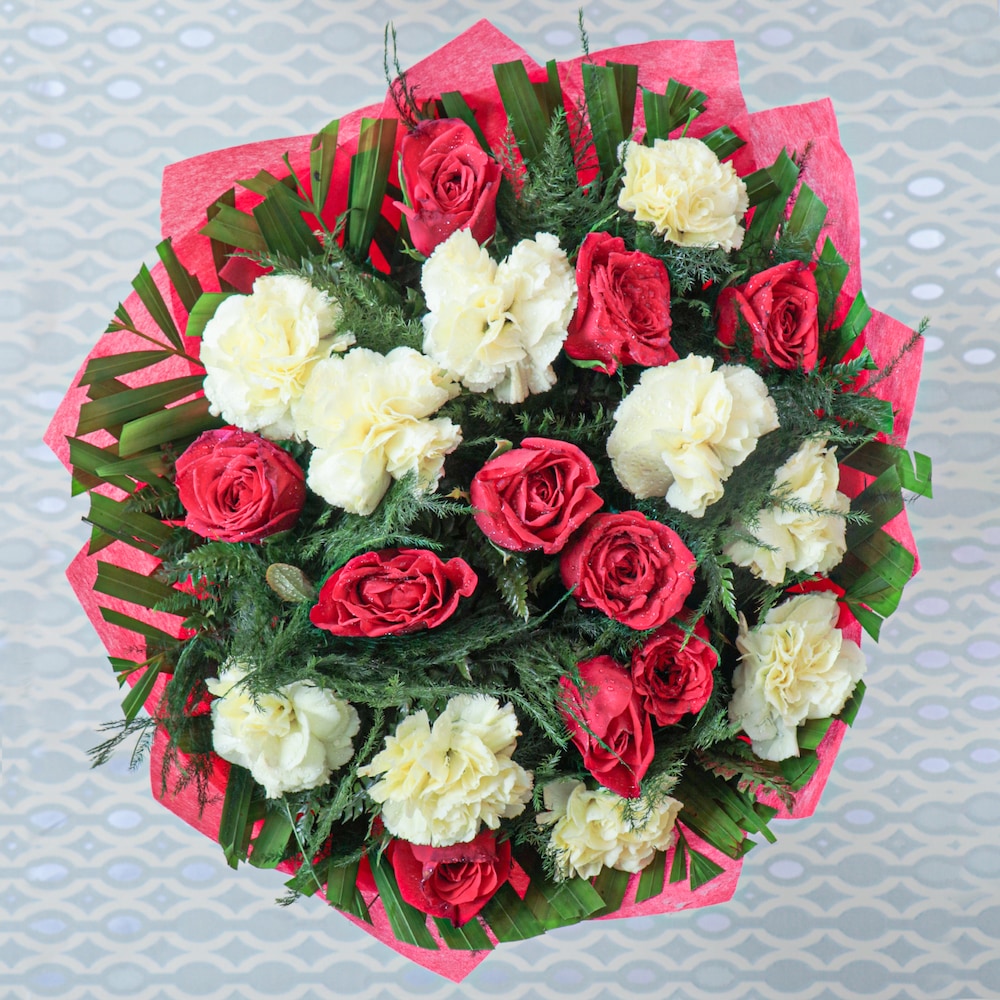 - Flowers Contains: 10 Red Roses + 10 White Carnations