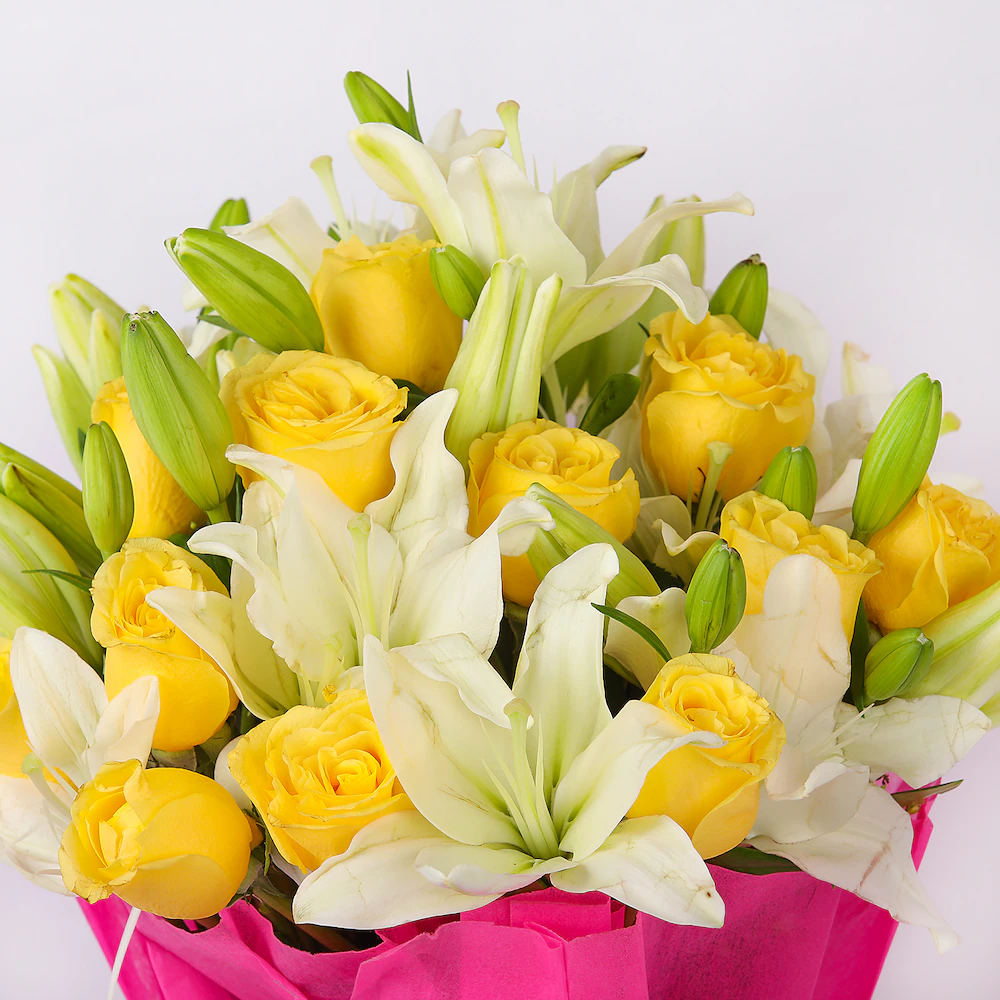 - Flowers Contains: 12 Yellow Roses , 10 White Lilies