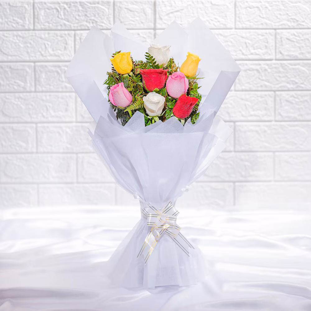- Flowers Contains: 2 Yellow Roses , 2 Pink Roses , 2 Red Roses , 2 White Roses