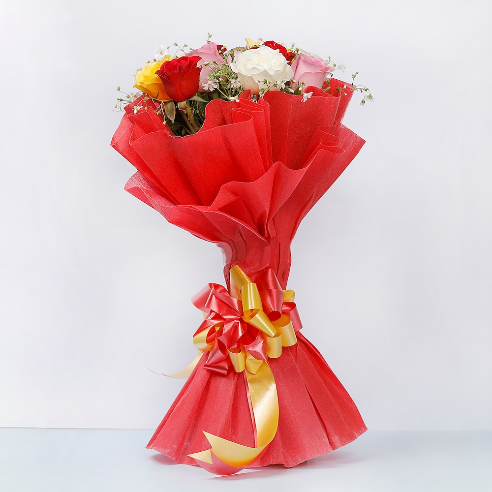 - Flowers Contains: 3 Yellow Roses , 3 Red Roses , 3 White Roses , 3 Pink Roses