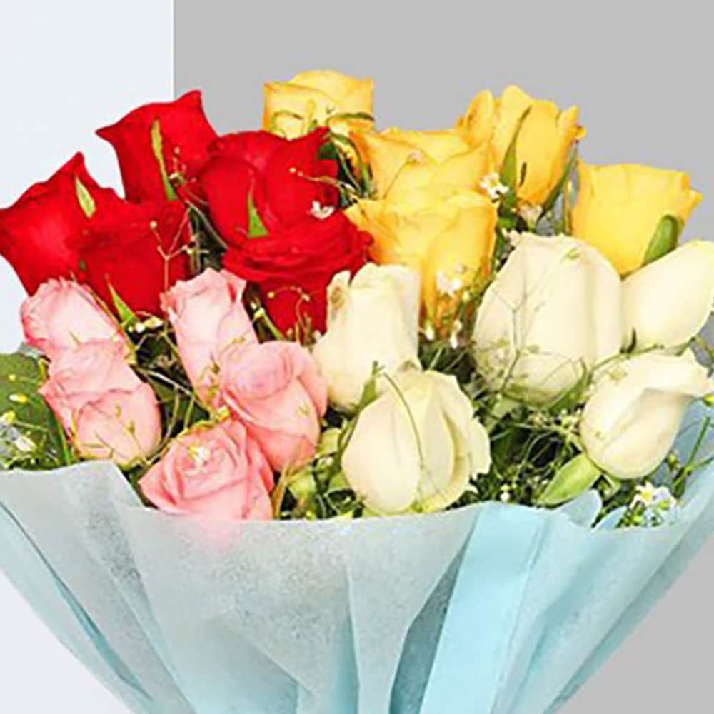 - Flowers Contains: 5 Red Roses + 5 Yellow Roses + 5 White Roses + 5 Pink Roses