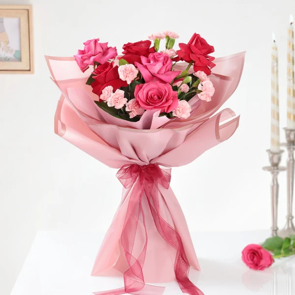 Make an enlightening statement of love and admiration with this stunning Radiant Pink Blossoms Bouquet. Featuring a beautiful blend of cerise pink roses, vibrant red roses, and delicate light pink spray carnations, this bouquet is a celebration of elegance and grace. The rich combination is accented by the gentle fragrance and wrapped in a mauve border sheet for a sophisticated finish. Tied together with a red tissue ribbon and enhanced with a soft pink tissue wrap, this bouquet is the perfect gift to express your heartfelt emotions on any special occasion.
