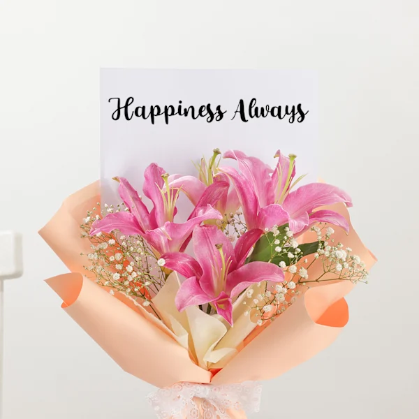 Make them feel truly special with this elegant bouquet of pink oriental lilies. Beautifully wrapped in a peach frosted sheet and off-white tissue, it is hand-tied with a delicate lace ribbon, exuding grace and charm.
