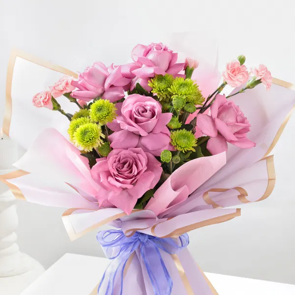 Created of deep purple roses, light pink spray carnations, and vibrant green button chrysanthemums, making this bouquet a true visual treat.