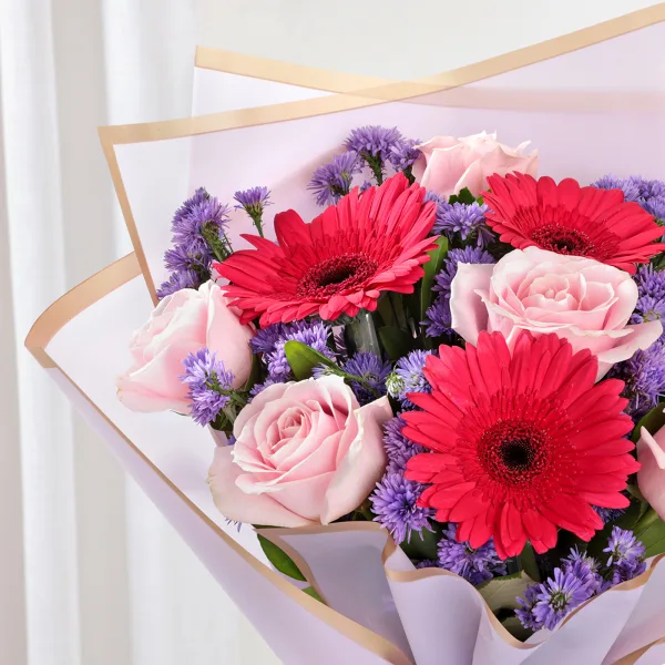 Featuring the vibrant beauty of dark pink Gerberas and the delicate allure of purple Daisies, this bouquet is further enhanced by Sweet Avalanche Roses in soft pink hues, creating a stunning contrast.
