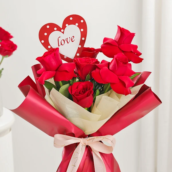 Elegant red roses are wrapped in soft off-white tissue and vibrant red sheet, hand-tied with a ribbon that sweetly declares, Always Love You.