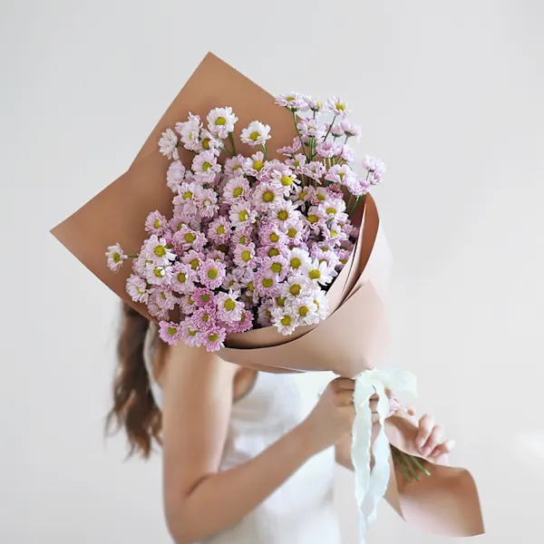 Pink Santini's in a soft, gentle hue are gathered with care and wrapped in rustic brown paper that carries a sense of comfort.