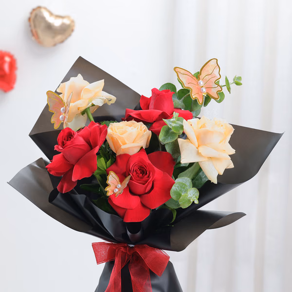 Express your love in a unique way with this breathtaking bouquet of red and peach roses, symbolizing passion and admiration.