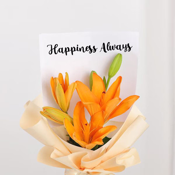 Brighten the day of your loved ones with this Radiant Lilies Happiness bouquet. A stunning arrangement of vibrant orange lilies, symbolising warmth, positivity, and energy, are expertly hand-tied and wrapped in soft, cream-coloured frosted sheets, finished with an elegant ribbon. Their striking colour and graceful form, completed with a white sheet that says Happiness Always make them a perfect expression of your love and admiration. Gift them a burst of sunshine and joy with this exquisite floral arrangement.