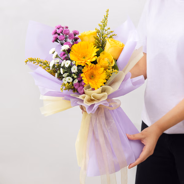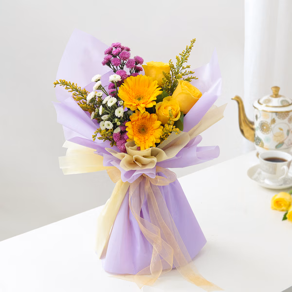 From the sunny yellow gerberas to the timeless yellow roses, this bouquet exudes a sense of positivity and happiness.