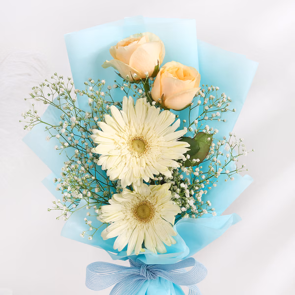 This stunning bouquet features a gorgeous assortment of exotic white gerberas and roses hand-selected and arranged by our expert florists.