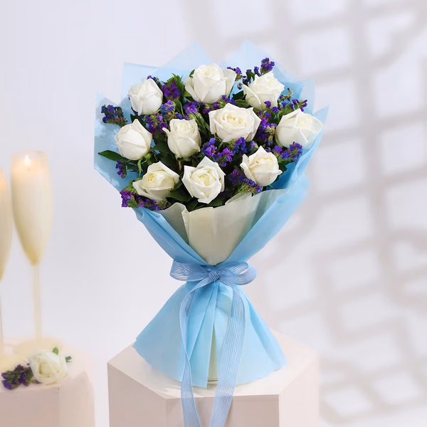 This mesmerizing bunch has 10 white roses that signify loyalty and some purple static that symbolize extravagance.