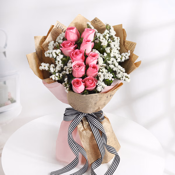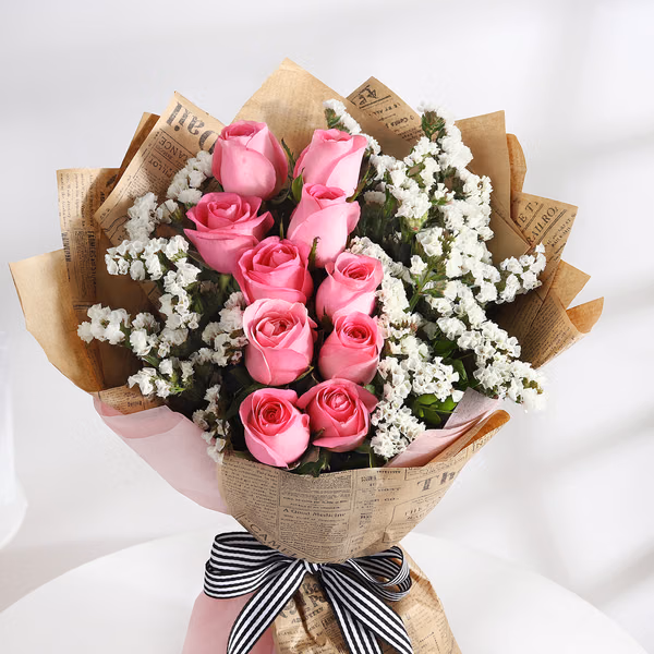 A bunch of 10 aqua pink roses that signify prosperity and some white static that symbolize remembrance.