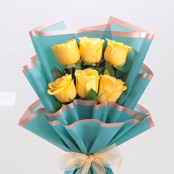 Radiate warmth and joy among your friends and family with this elegant bouquet of six yellow roses, thoughtfully arranged to capture the beauty of heartfelt gestures.