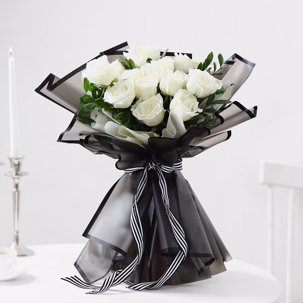 Embrace the timeless elegance of contrast with this exquisite bouquet of white roses, elegantly wrapped in a black translucent sheet and tied together with a striking black and white ribbon.