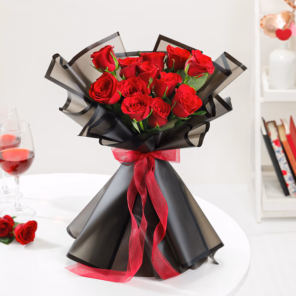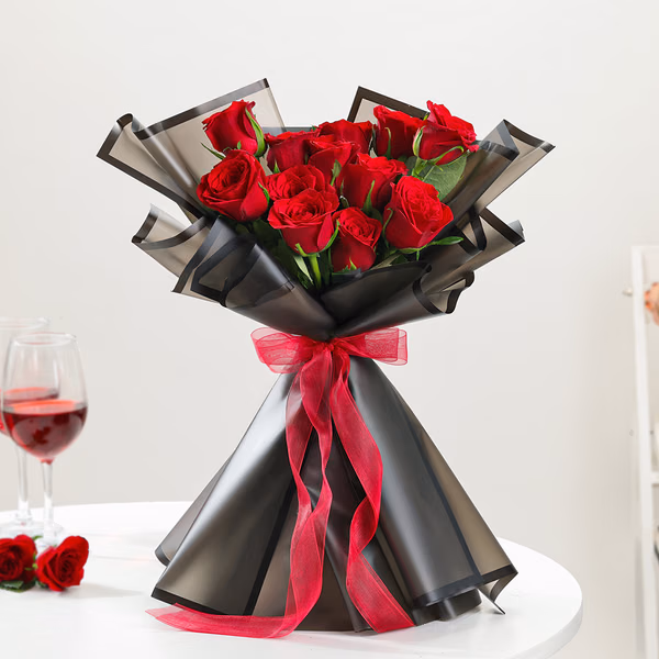 Wrapped in a sophisticated black border sheet, the bouquet is further enhanced with a luxurious red tissue ribbon, adding an extra layer of charm and refinement.