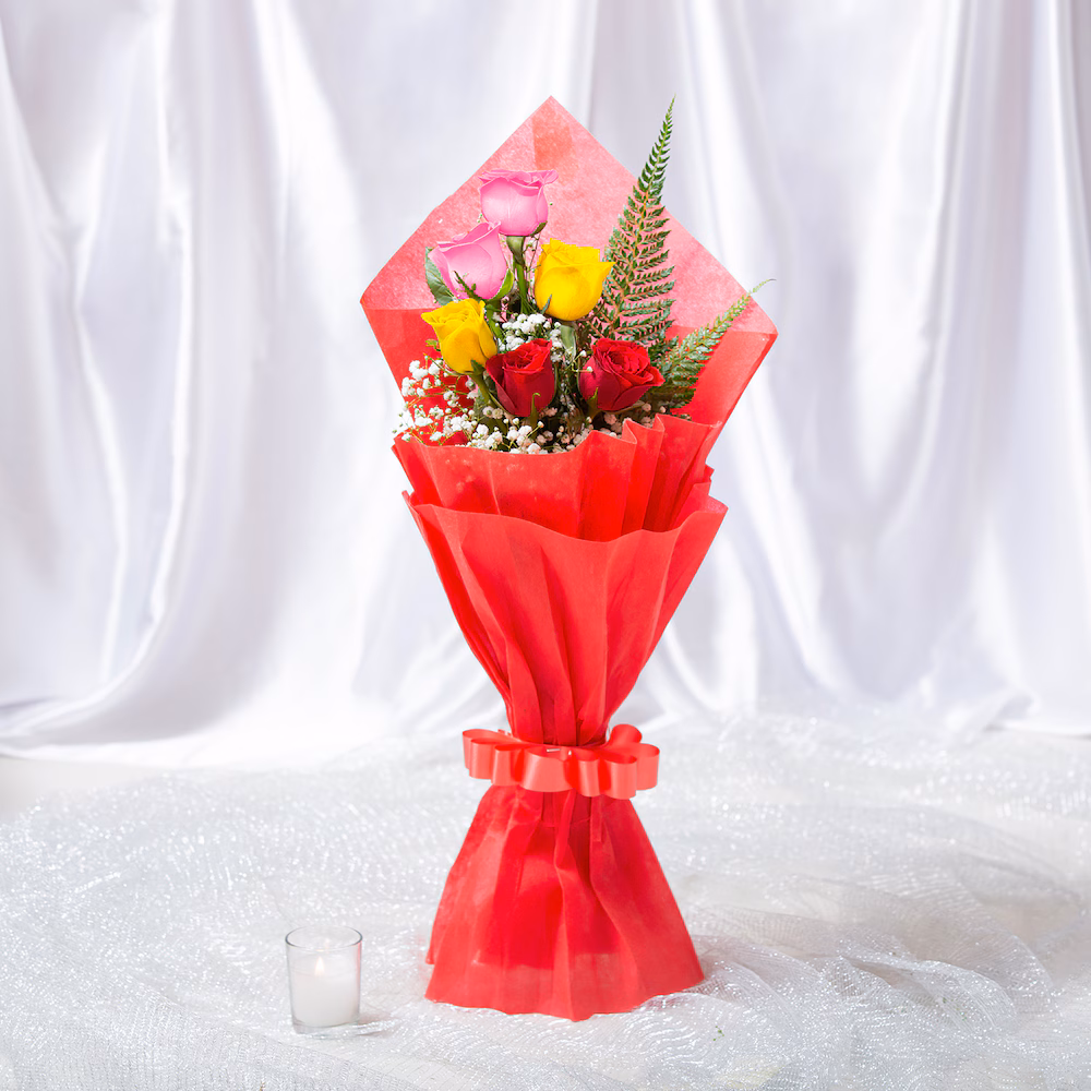 - Flowers Contains: 2 Red Roses + 2 Pink Roses + 2 Yellow Roses