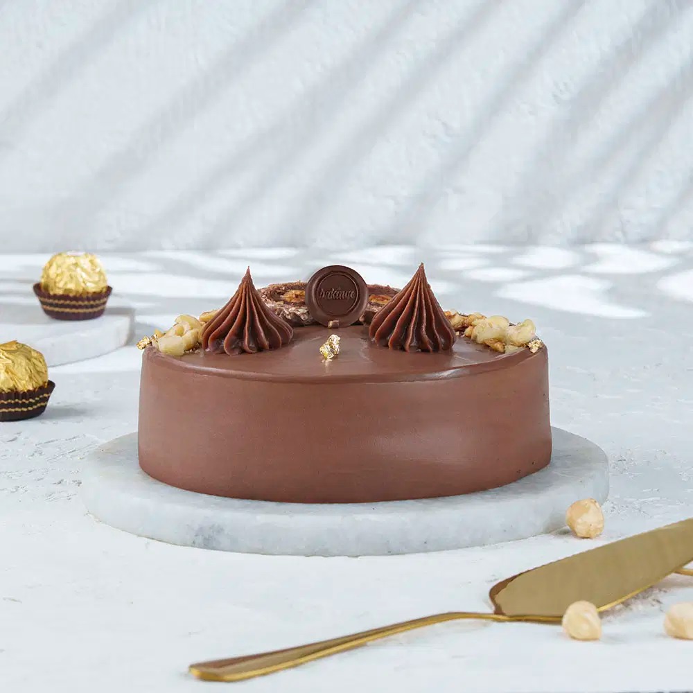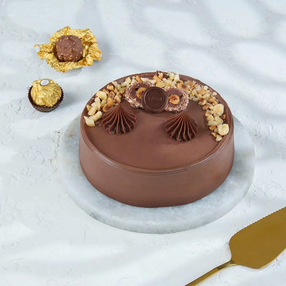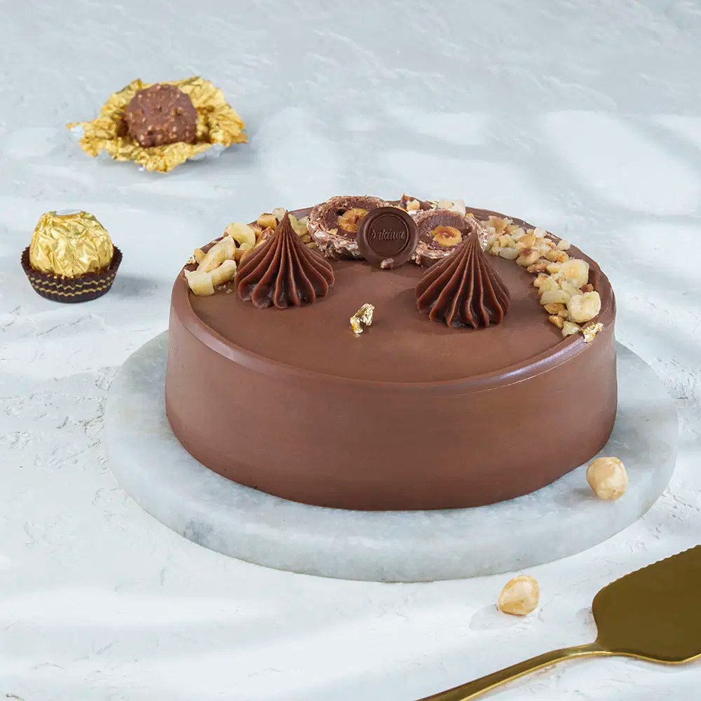 A delicious concoction of chocolate, Nutella and milk chocolate with chunks of Ferrero Rochers and roasted hazelnuts.